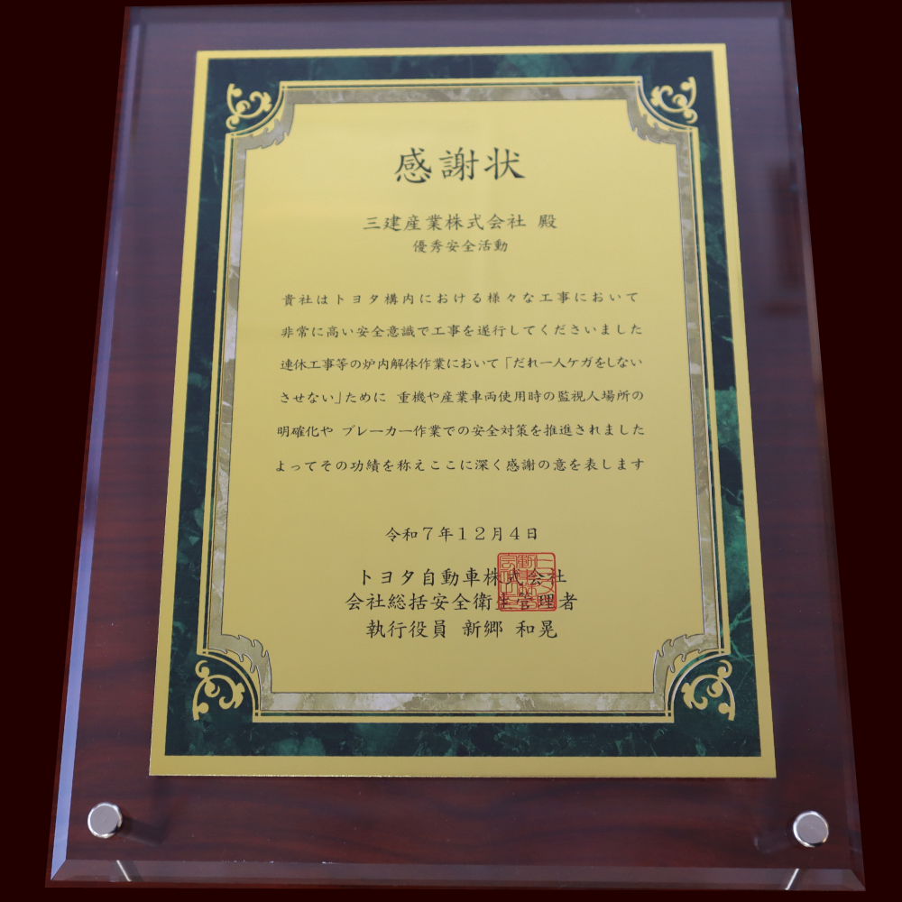 [感謝状本文]貴社はトヨタ構内における様々な工事において非常に高い安全意識で工事を遂行してくださいました。連休工事等の炉内解体作業において「だれ一人ケガをしないさせない」ために 重機や産業車両使用時の監視人場所の明確化や ブレーカー作業での安全対策を推進されました。よってその功績を称えここに深く感謝の意を表します。