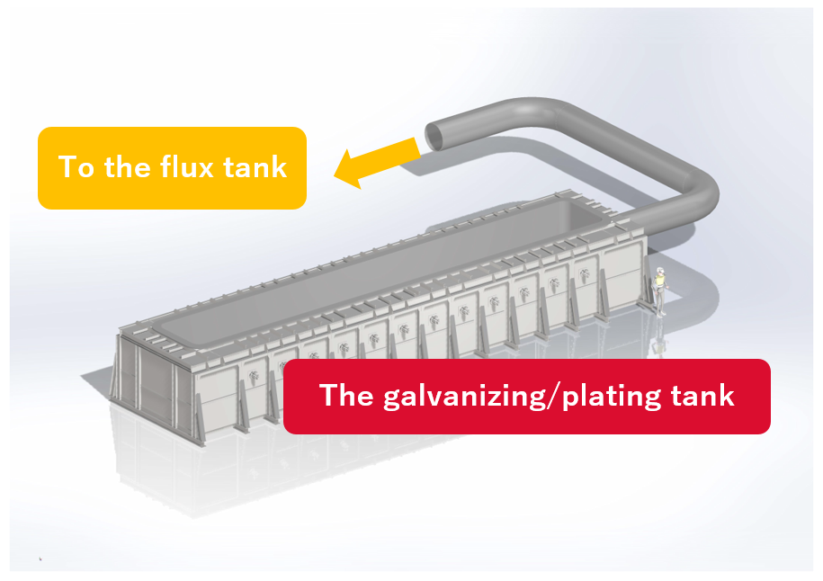 This is a ceramic bath type plating furnace in which uses a special castable for zinc resistance installed in the equipment and the heat source ( self-exhaust heat recovery type single-ended radiant burner + ceramic immersion tube) is directly immersed in the molten zinc. Since no iron pot is used, there is Zero risk of molten metal leakage due to erosion, and the furnace can be used semi-permanently. In addition, it eliminates the need for production stoppages and production adjustments during kettle changeover periods, thereby improving productivity and running costs.